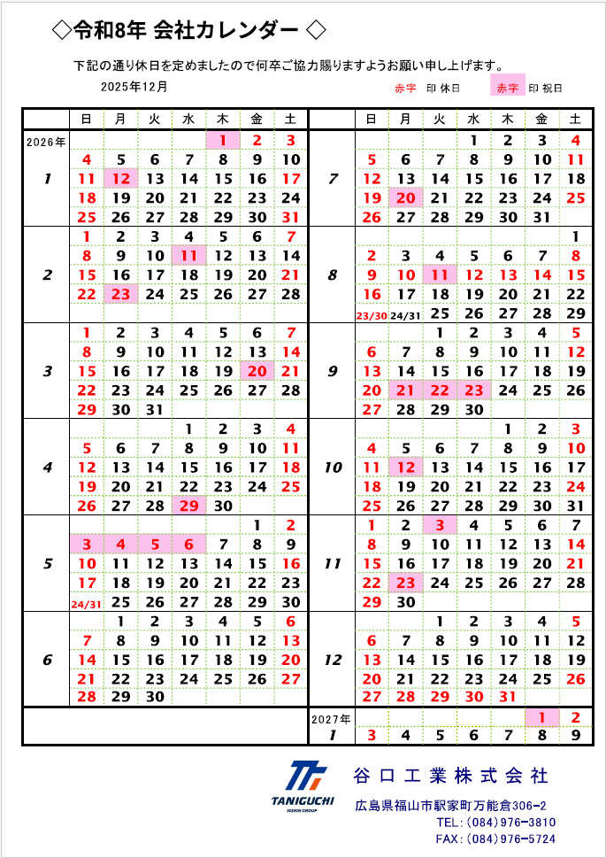 平素は格別のご高配を賜り、誠にありがとうございます。2026年度の当社年間休日カレンダーを掲載いたします。下記よりPDFをダウンロードいただけます。